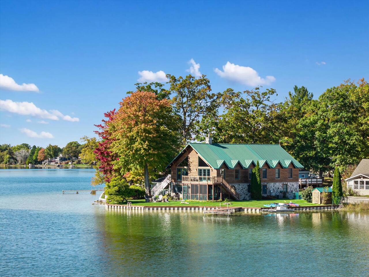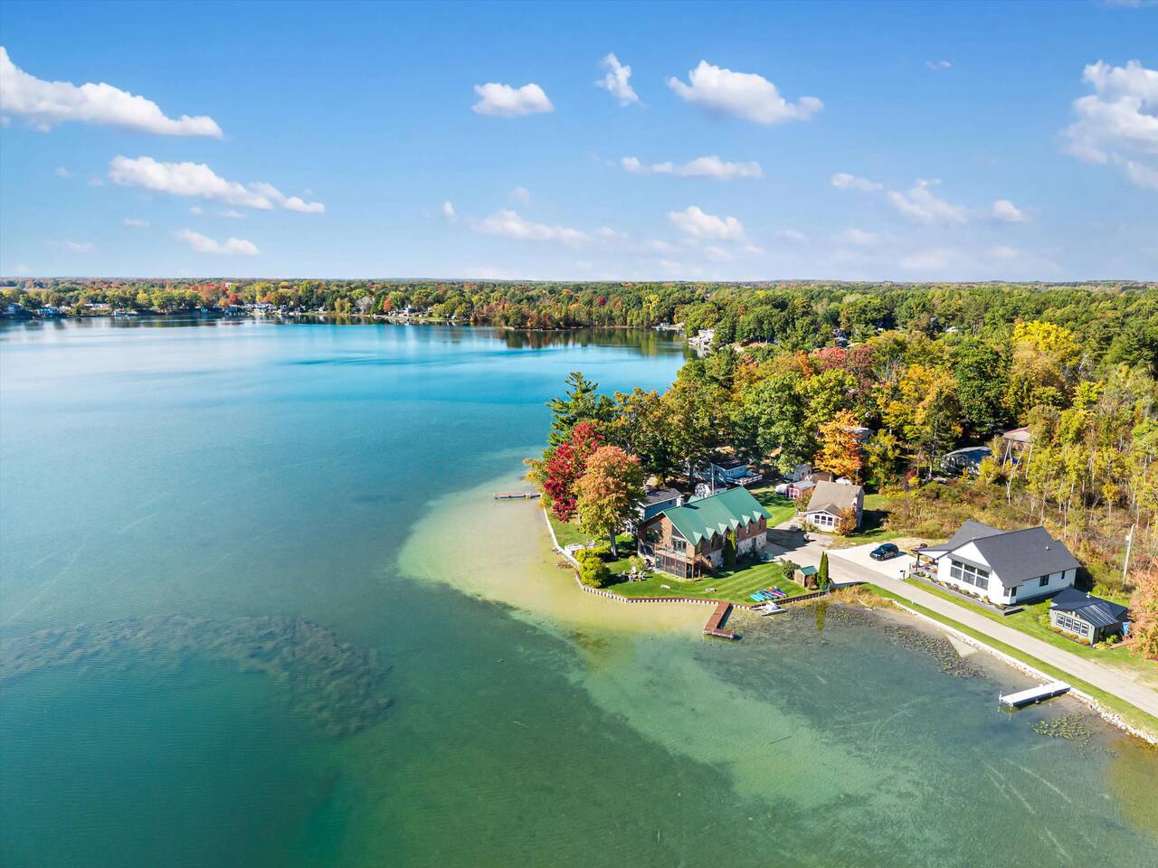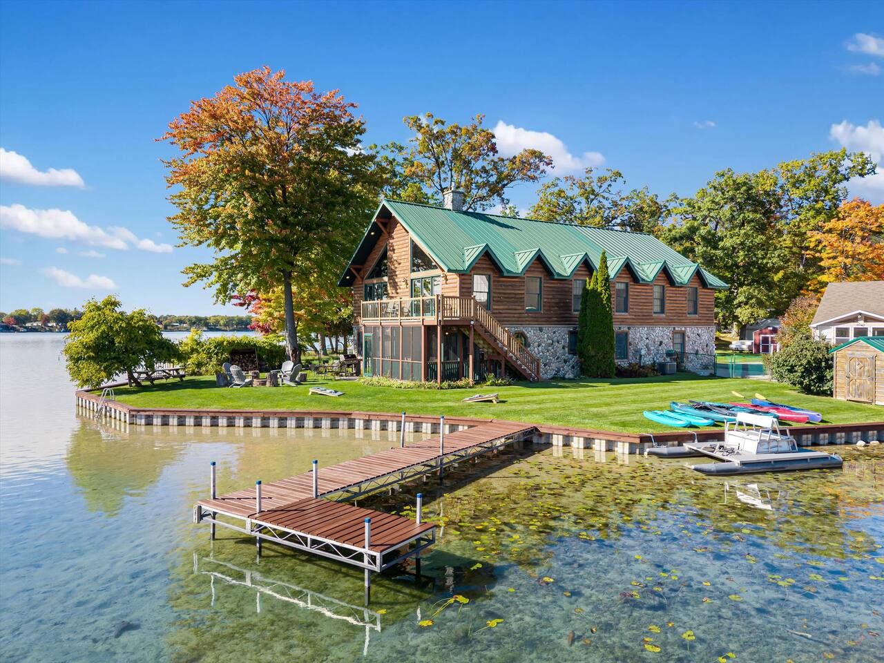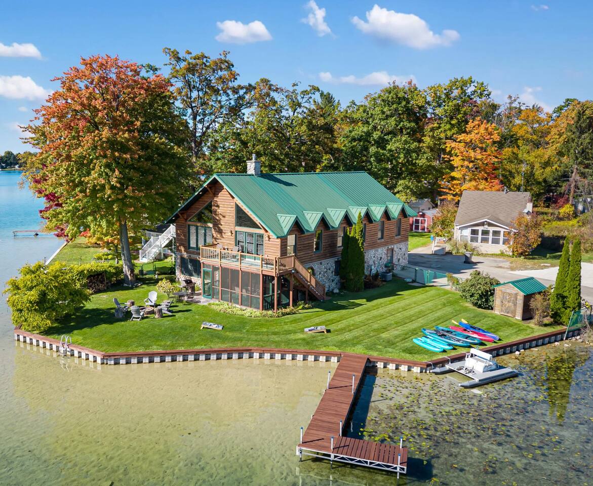 Step outside to 150 feet of private water frontage, where mornings start with coffee on the deck and end by the fire pit under a canopy of stars. Kids will love splashing in the shallow, sandy section of shoreline—just 1.5 to 2 feet deep—while adults glide across the lake on kayaks and a pedal boat (provided in season). Bring your fishing gear and cast a line for bass or bluegill, or bring your own pontoon to tie up at the private dock! Inside, unwind in the indoor hot tub—your year-round retreat tucked away in its own dedicated room. The open-concept living area features a soaring two-story stone fireplace, Smart TV, and plush seating—perfect for movie nights or relaxed afternoons together. Upstairs, the loft is ideal for board games, cards, and late-night conversations, while the ping pong table in the garage keeps the fun going for all ages. The fully equipped kitchen makes cooking for a crowd easy, stocked with everything from a crock pot to a French press and blender. Grill out on the Weber grill, share family-style dinners indoors or in the screened porch, and watch the sunset reflect across the lake while the fire crackles outside. When it’s time to rest, you’ll find multiple bedrooms and cozy spaces that comfortably sleep up to 19 guests. Whether curling up with a book in the loft bean bag or enjoying peaceful views from the upstairs deck, every spot feels like home. Families especially love the thoughtful extras—outdoor games, a spacious yard, and free firewood for your first night. Wi-Fi and a dedicated workspace make remote work easy, while the quiet setting ensures true relaxation. You’re close enough for day trips, yet far enough to truly unplug—just 15 minutes to Greenville and only 45 minutes from Downtown Grand Rapids, where you’ll find breweries, restaurants, museums, and entertainment. Nearby attractions also include Tower Mountain Sledding (15 mins), Cannonsburg Ski Area (40 mins), Deer Tracks Junction (30 mins), Anderson & Girls Farm (10 mins), Crystal Motor Speedway (20 mins), multiple golf courses, and the Fred Meijer Trail just 5 minutes away. Please note: Primary guest must be 25+, no pets or parties, and parking is limited to six vehicles (four outside, two in garage). Please read the full house rules before booking. Whether it’s sunshine and kayaking in summer or cozy fires and ice fishing in winter, The Derby Lodge offers the perfect blend of comfort, connection, and adventure. Book your family or friend’s retreat today—Derby Lake dates fill fast!