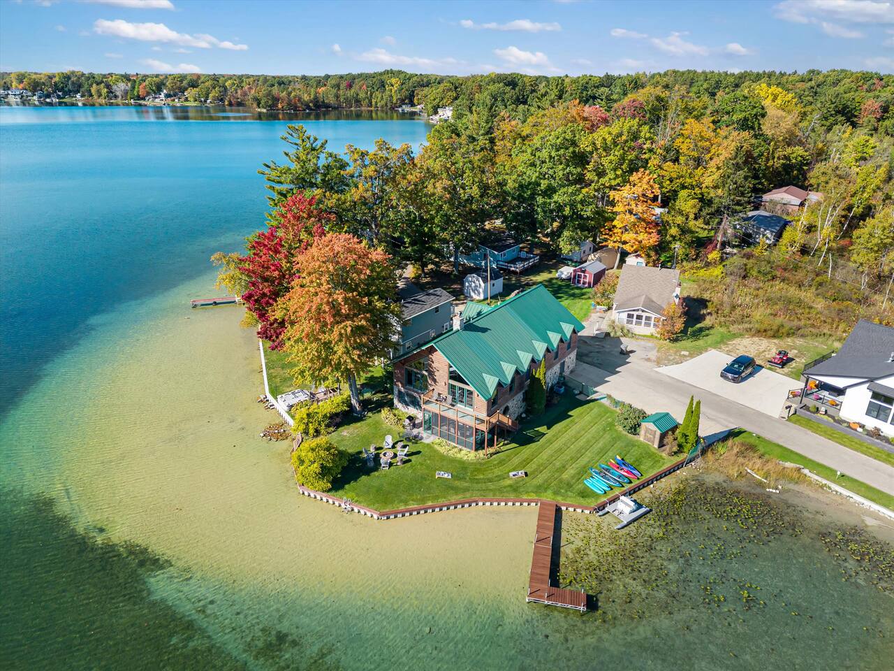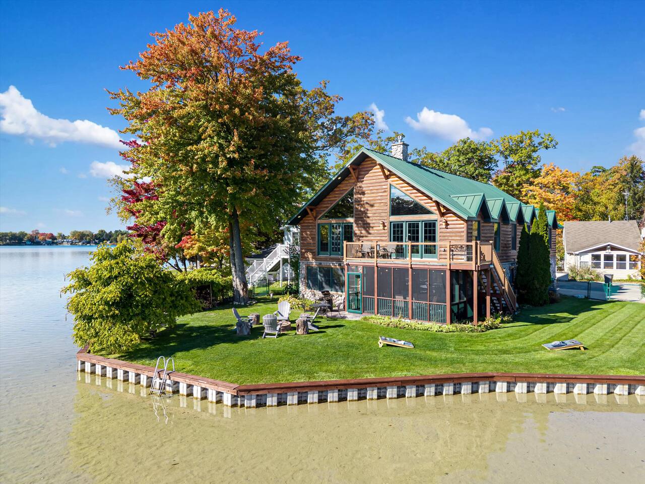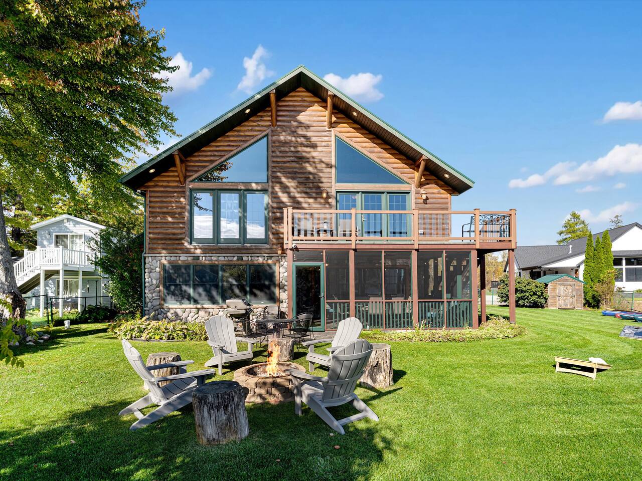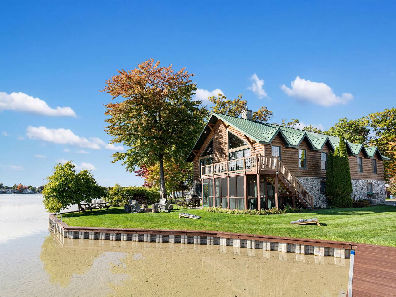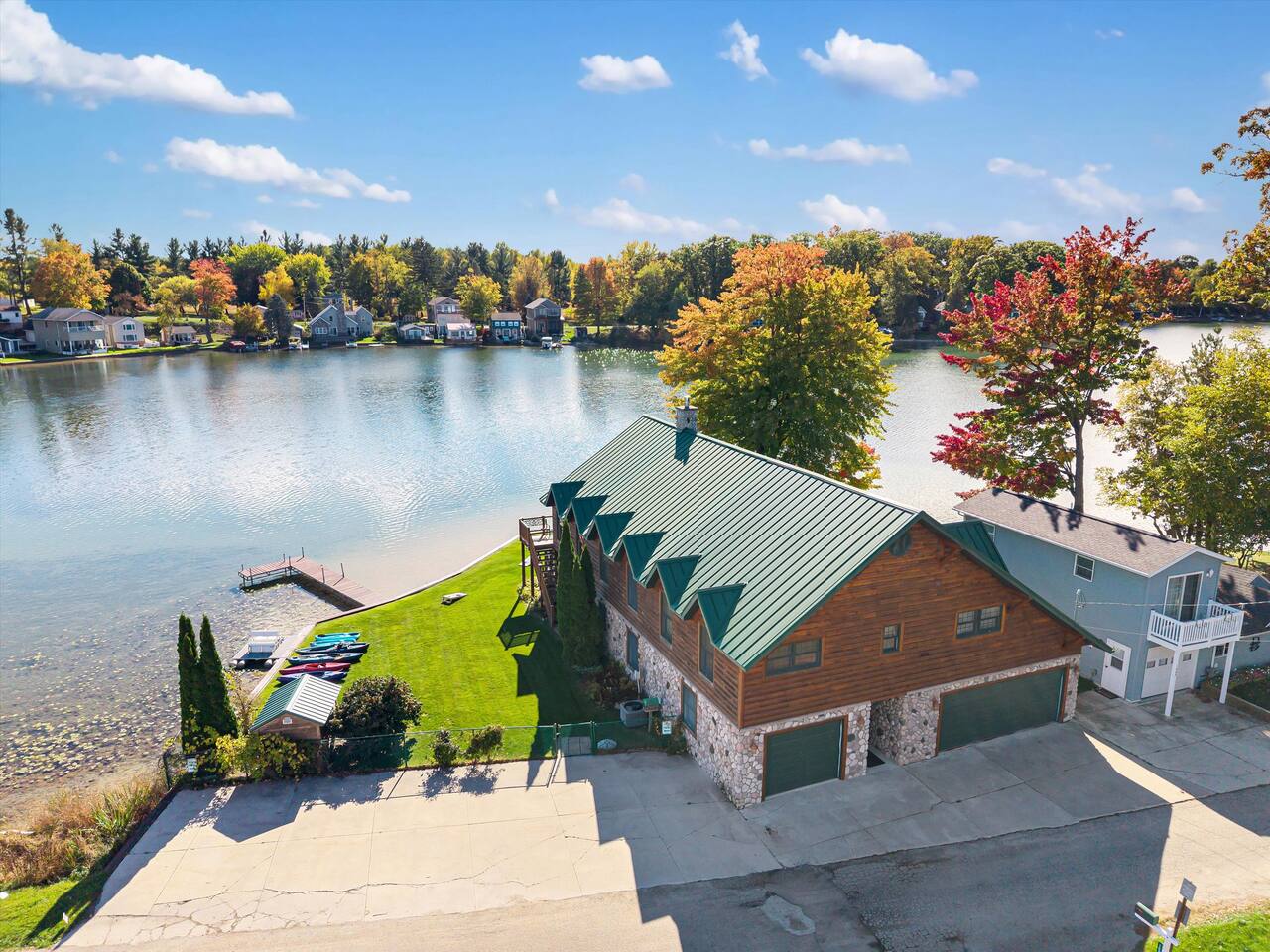 Step outside to 150 feet of private water frontage, where mornings start with coffee on the deck and end by the fire pit under a canopy of stars. Kids will love splashing in the shallow, sandy section of shoreline—just 1.5 to 2 feet deep—while adults glide across the lake on kayaks and a pedal boat (provided in season). Bring your fishing gear and cast a line for bass or bluegill, or bring your own pontoon to tie up at the private dock! Inside, unwind in the indoor hot tub—your year-round retreat tucked away in its own dedicated room. The open-concept living area features a soaring two-story stone fireplace, Smart TV, and plush seating—perfect for movie nights or relaxed afternoons together. Upstairs, the loft is ideal for board games, cards, and late-night conversations, while the ping pong table in the garage keeps the fun going for all ages. The fully equipped kitchen makes cooking for a crowd easy, stocked with everything from a crock pot to a French press and blender. Grill out on the Weber grill, share family-style dinners indoors or in the screened porch, and watch the sunset reflect across the lake while the fire crackles outside. When it’s time to rest, you’ll find multiple bedrooms and cozy spaces that comfortably sleep up to 19 guests. Whether curling up with a book in the loft bean bag or enjoying peaceful views from the upstairs deck, every spot feels like home. Families especially love the thoughtful extras—outdoor games, a spacious yard, and free firewood for your first night. Wi-Fi and a dedicated workspace make remote work easy, while the quiet setting ensures true relaxation. You’re close enough for day trips, yet far enough to truly unplug—just 15 minutes to Greenville and only 45 minutes from Downtown Grand Rapids, where you’ll find breweries, restaurants, museums, and entertainment. Nearby attractions also include Tower Mountain Sledding (15 mins), Cannonsburg Ski Area (40 mins), Deer Tracks Junction (30 mins), Anderson & Girls Farm (10 mins), Crystal Motor Speedway (20 mins), multiple golf courses, and the Fred Meijer Trail just 5 minutes away. Please note: Primary guest must be 25+, no pets or parties, and parking is limited to six vehicles (four outside, two in garage). Please read the full house rules before booking. Whether it’s sunshine and kayaking in summer or cozy fires and ice fishing in winter, The Derby Lodge offers the perfect blend of comfort, connection, and adventure. Book your family or friend’s retreat today—Derby Lake dates fill fast!