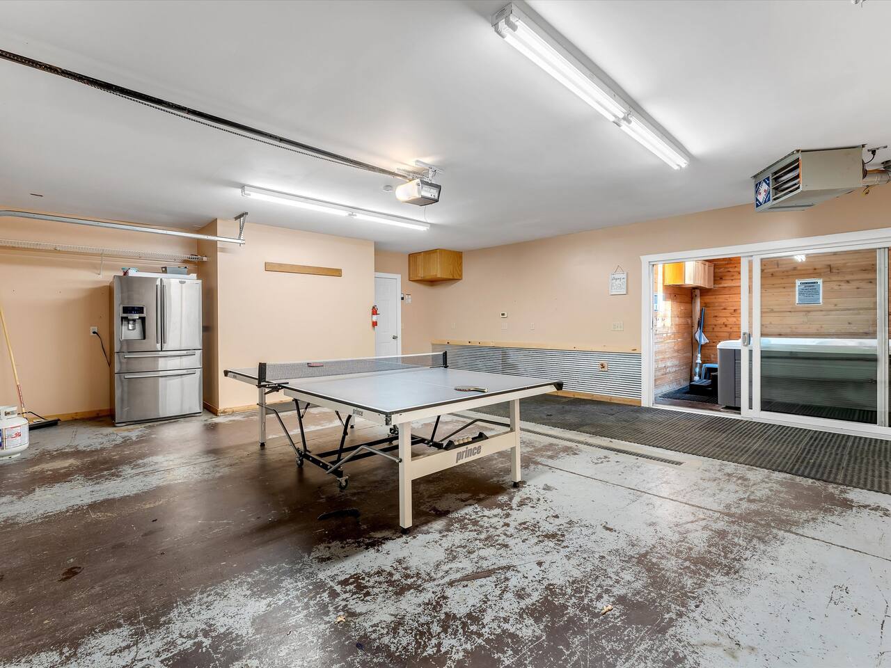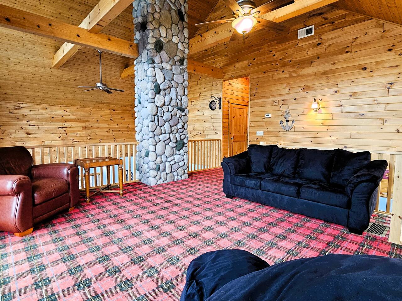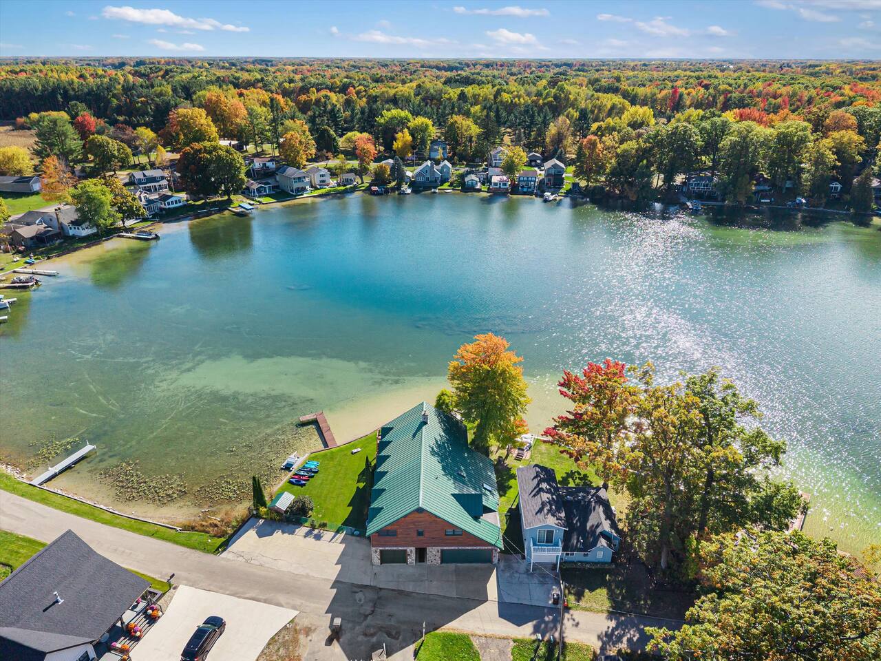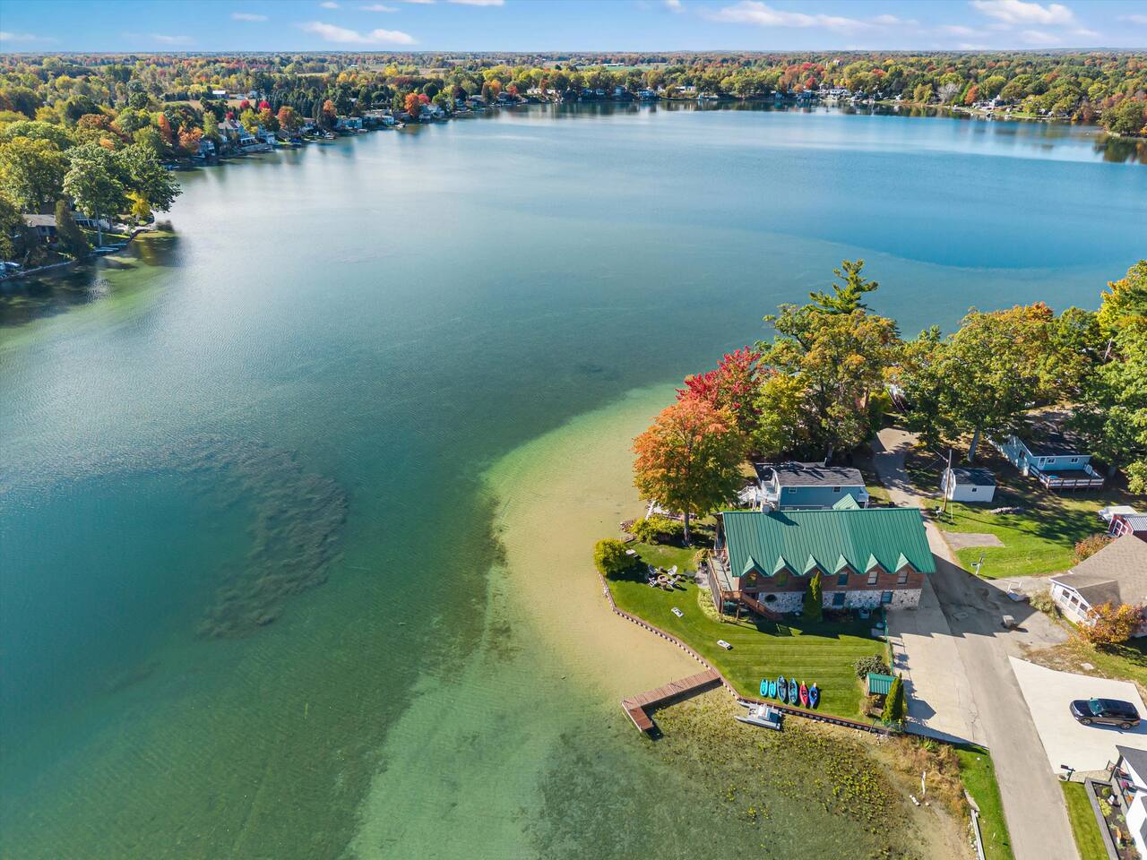 Step outside to 150 feet of private water frontage, where mornings start with coffee on the deck and end by the fire pit under a canopy of stars. Kids will love splashing in the shallow, sandy section of shoreline—just 1.5 to 2 feet deep—while adults glide across the lake on kayaks and a pedal boat (provided in season). Bring your fishing gear and cast a line for bass or bluegill, or bring your own pontoon to tie up at the private dock! Inside, unwind in the indoor hot tub—your year-round retreat tucked away in its own dedicated room. The open-concept living area features a soaring two-story stone fireplace, Smart TV, and plush seating—perfect for movie nights or relaxed afternoons together. Upstairs, the loft is ideal for board games, cards, and late-night conversations, while the ping pong table in the garage keeps the fun going for all ages. The fully equipped kitchen makes cooking for a crowd easy, stocked with everything from a crock pot to a French press and blender. Grill out on the Weber grill, share family-style dinners indoors or in the screened porch, and watch the sunset reflect across the lake while the fire crackles outside. When it’s time to rest, you’ll find multiple bedrooms and cozy spaces that comfortably sleep up to 19 guests. Whether curling up with a book in the loft bean bag or enjoying peaceful views from the upstairs deck, every spot feels like home. Families especially love the thoughtful extras—outdoor games, a spacious yard, and free firewood for your first night. Wi-Fi and a dedicated workspace make remote work easy, while the quiet setting ensures true relaxation. You’re close enough for day trips, yet far enough to truly unplug—just 15 minutes to Greenville and only 45 minutes from Downtown Grand Rapids, where you’ll find breweries, restaurants, museums, and entertainment. Nearby attractions also include Tower Mountain Sledding (15 mins), Cannonsburg Ski Area (40 mins), Deer Tracks Junction (30 mins), Anderson & Girls Farm (10 mins), Crystal Motor Speedway (20 mins), multiple golf courses, and the Fred Meijer Trail just 5 minutes away. Please note: Primary guest must be 25+, no pets or parties, and parking is limited to six vehicles (four outside, two in garage). Please read the full house rules before booking. Whether it’s sunshine and kayaking in summer or cozy fires and ice fishing in winter, The Derby Lodge offers the perfect blend of comfort, connection, and adventure. Book your family or friend’s retreat today—Derby Lake dates fill fast!